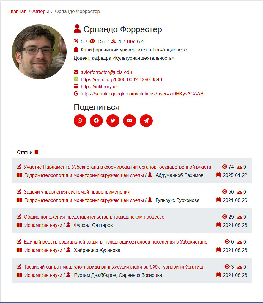 На странице автора будут отображаться статьи автора, со всех журналов, если на вашем сайте OJS несколько журналов. Так же ведётся статистика автора подсчитывается сумма просмотров и скачиваний, из этих данных подсчитывается внутренний индекс inR для автора. Так же видны некоторые данные автора.