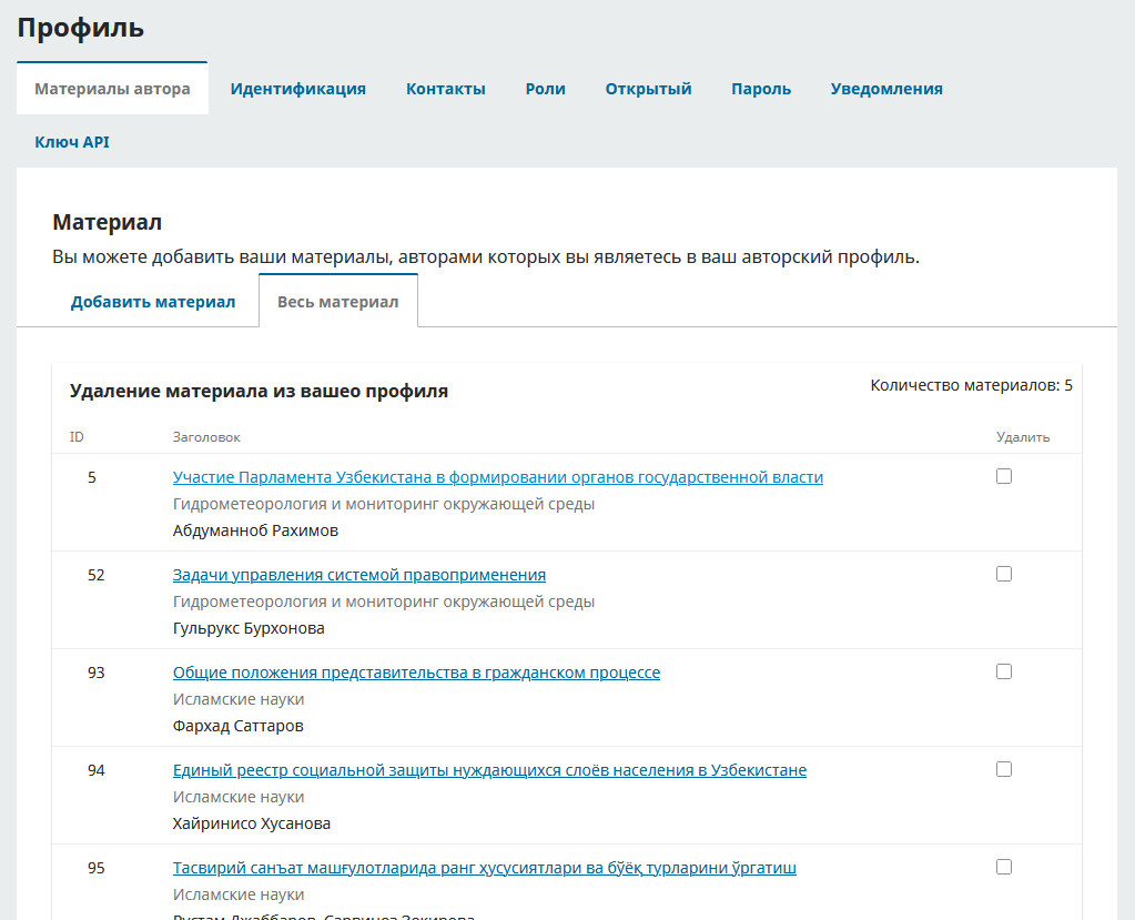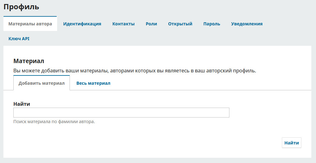 Иногда бывает так что статьи автора были добавлены не им самим, например редакторами журнала или автор является соавтором статьи. Для того что бы автор смог добавить в свой профиль такую статью, в панели профиля добавлена вкладка “Материалы автора”, в этой вкладке автор может произвести поиск своей статьи и добавить её. Также есть возможность удалить статью из его профиля.