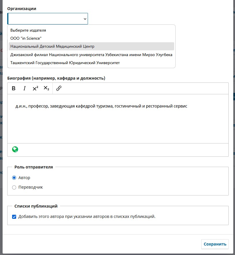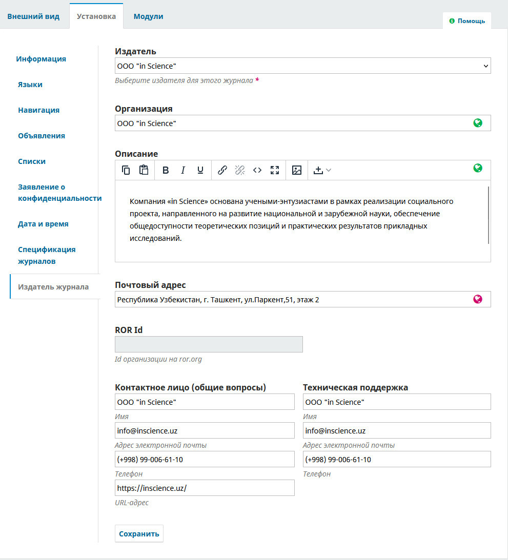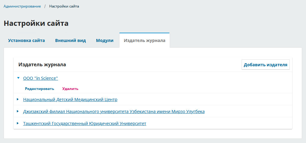 В настройках сайта добавлена вкладка Издатель журнала, в этой вкладке вы можете добавлять организации.